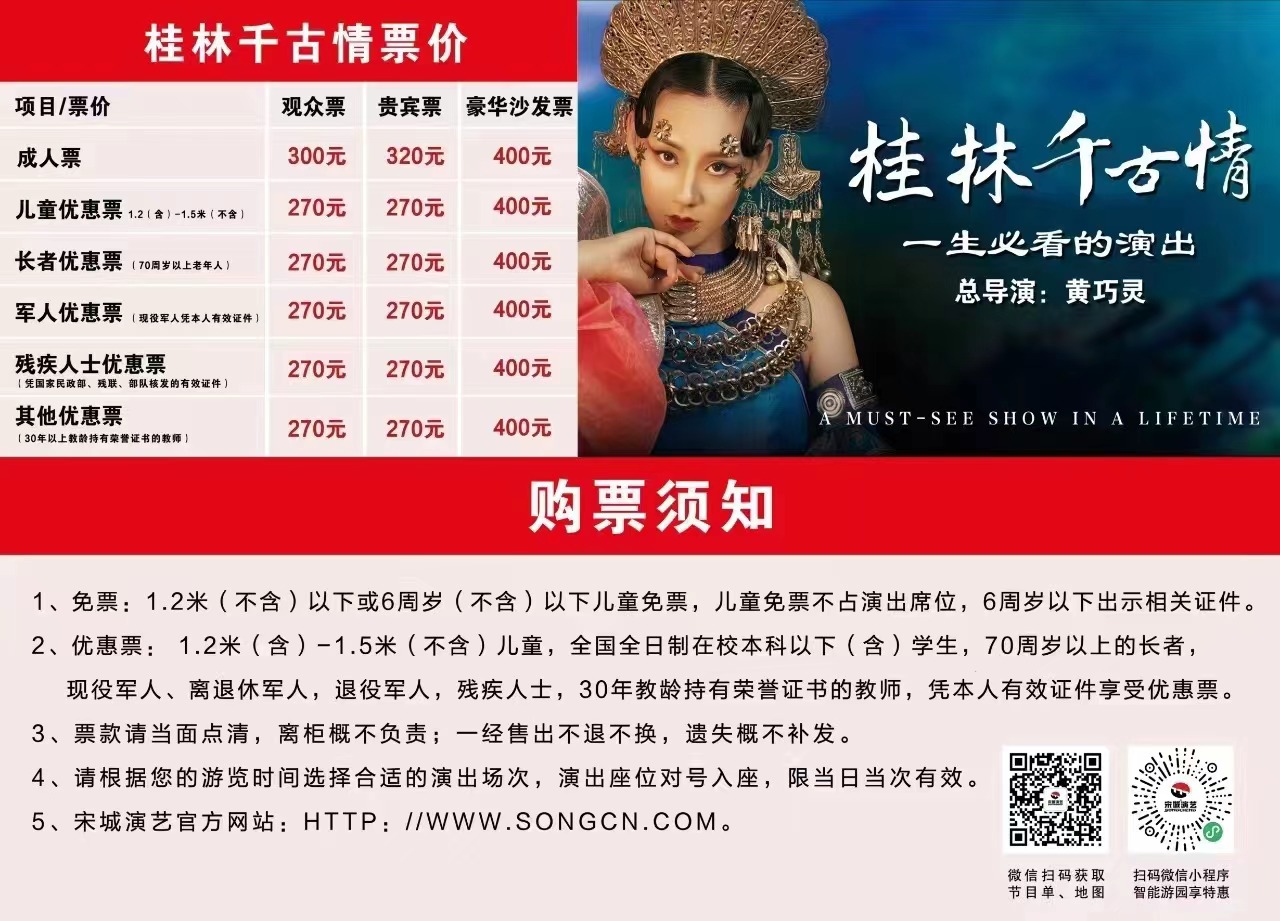 由宋城演艺和桂林旅股联合打造的桂林千古情景区,再现了桂林的历史文化与民族风情,老少同乐、晴雨皆宜。核心演出大型歌舞《桂林千古情》是一生必看的演出,视觉盛宴,心灵震撼,唱响了一曲感天动地的桂林千古传奇。